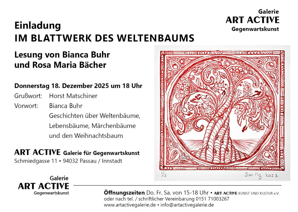 Vor einem Jahr entstand unter Mitwirkung von Dr. Martin Ortmeier (Redaktion und Nachwort) – und gefördert von der Dr. Hans-Karl Fischer Stiftung, der Stadt Passau und der Kulturstiftung des Bezirks Niederbayern – der Gedichtband „Im Blattwerk des Weltenbaums“, der Werke der Passauer Lyrikerinnen Rosa Maria Bächer und Bianca Buhr miteinander vereint. Der Weltenbaum ist als Symbol der kosmischen Ordnung in vielen Kulturen und Religionen verwurzelt. Er verbindet als Weltachse die drei Ebenen Unterwelt, Erde und Himmel. Er wirkt als dunkler Urgrund alles Werdens, als Baum des Lebens mit Licht und Schatten und er ist Leiter zum Himmel. In den Gedichten ihres gemeinsamen Buches umkreisen Bächer und Buhr dieses uralte Symbol, erkunden verschlungene Pfade zwischen den Welten und beschreiben wortschöpferisch das Blattwerk des Weltenbaums.